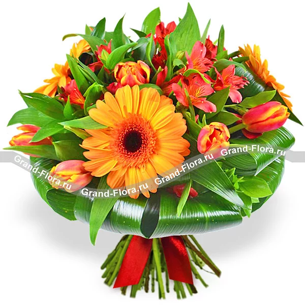 Стандартный: гербера оранжевая - 3 шт., альстромерия оранжевая - 3 шт., тюльпаны оранжевые - 5 шт., декоративная зелень, лист аспидистры - 5 шт., лента.